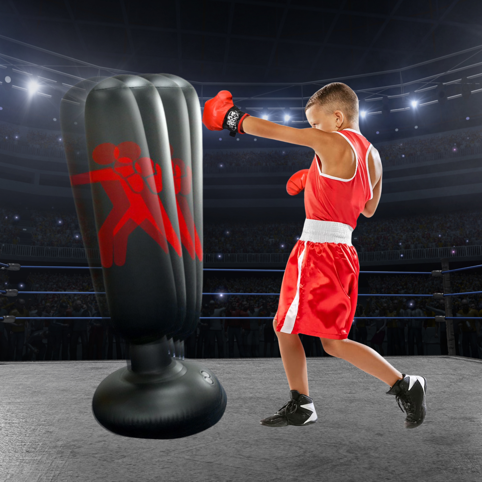 To get started, fill the base with sand or water to keep it stable. Then, inflate the top section using a pump until it's firm and upright. Once it's set up on a flat surface, you’re ready to start punching! The bag will bounce back after each hit, making it a fun and energetic workout. When you're done, simply empty the base and deflate the top for easy storage.